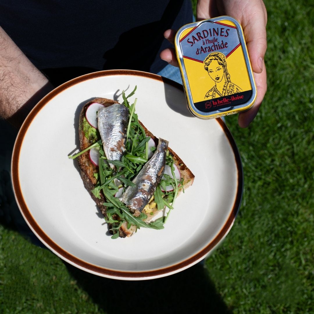 - A teď ta nejdůležitější tečka – otevřete plechovku sardinek. Opatrně vyjměte rybičky, ideálně v celku, a položte je na už zčásti obložený chléb. Podle chuti zakápněte trochou oleje z konzervy.
