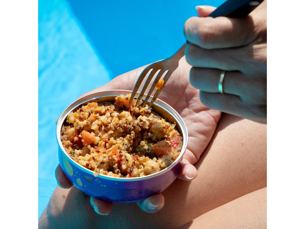 - Složení: Zelenina (34%) (mrkev (17%), smažené červené papriky (9%), polosušená rajčata (4%), cizrna (3%)), voda, tuňák křídlatý (thunnus alalunga) (18%), extra panenský olivový olej, bílá a červená quinoa (6,8%), zelené olivy (4,5%), citronová šťáva, citron konzervovaný solí (siřičitany) (2%), bramborový škrob, bylinky, koření, sůl.